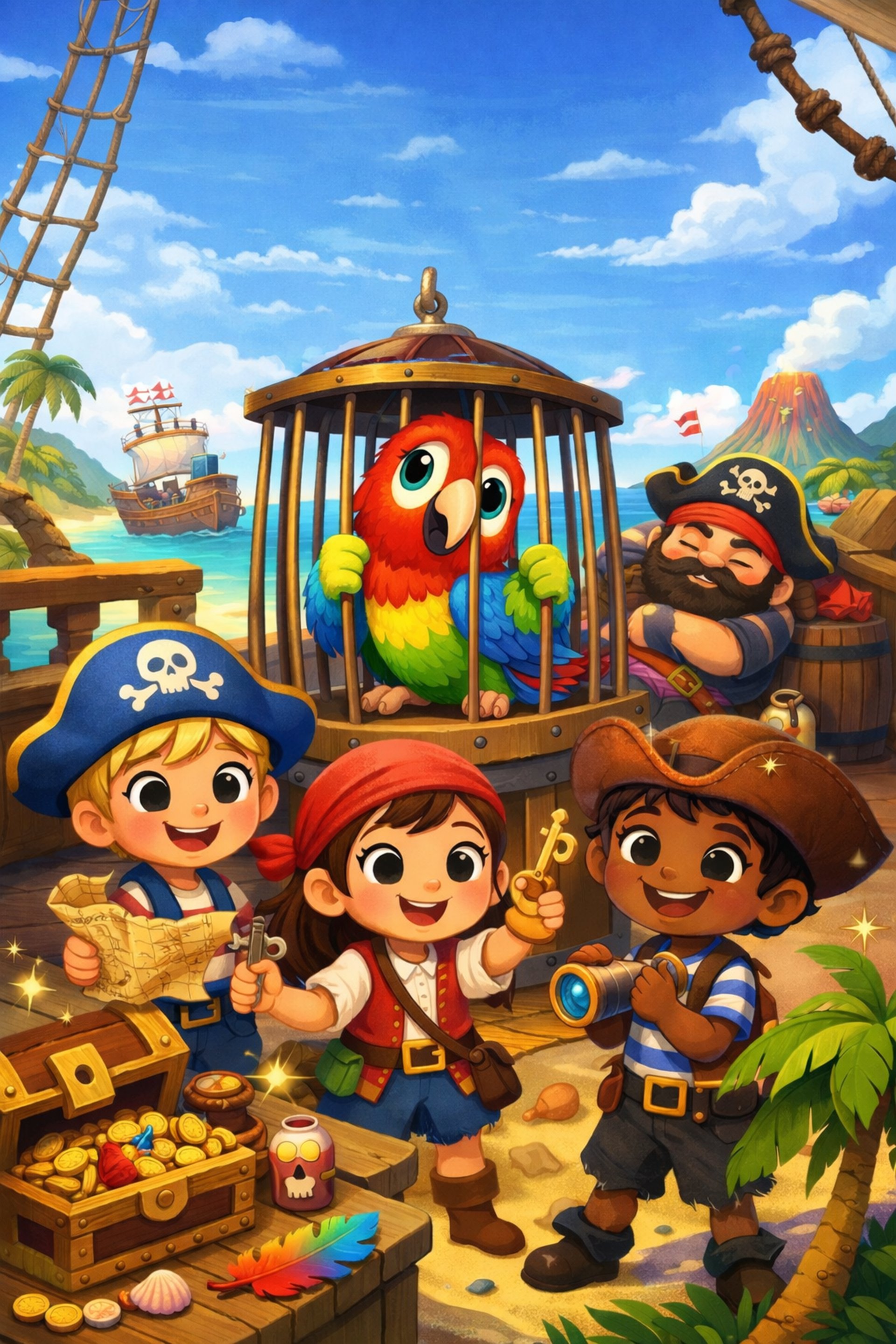 Sur l'île aux Pirates, Coco le perroquet a été enfermé dans une cage par le vilain pirate Barbe-Grise. Les petits pirates reçoivent une mission importante: retrouver la clé magique pour ouvrir la cage de Coco !