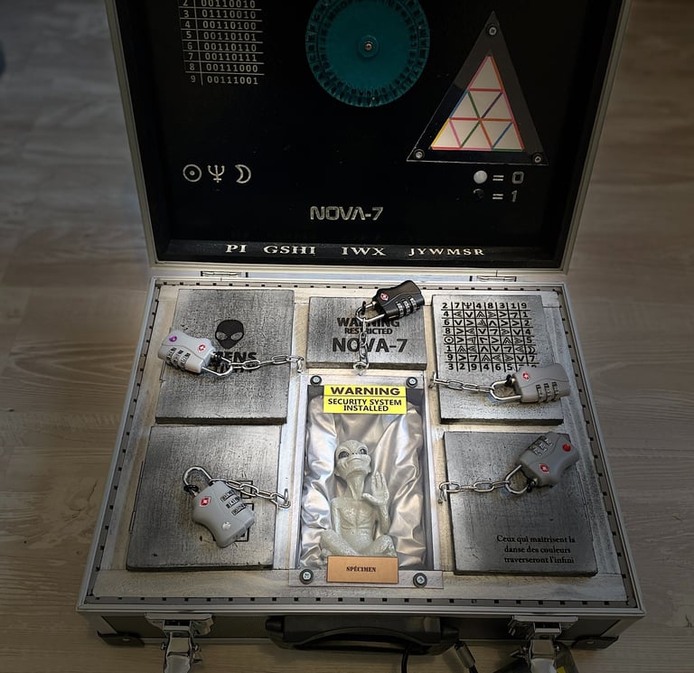 Vous êtes devant une mystérieuse mallette, un objet qui a voyagé à travers l’immensité de l’espace à bord du légendaire vaisseau Nova-7. Elle appartenait à l’équipage, aujourd’hui porté disparu, et semble être la clé d’un secret d’une importance capitale. Cette mallette a été conçue pour protéger son contenu à tout prix. Que contient-elle ?